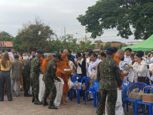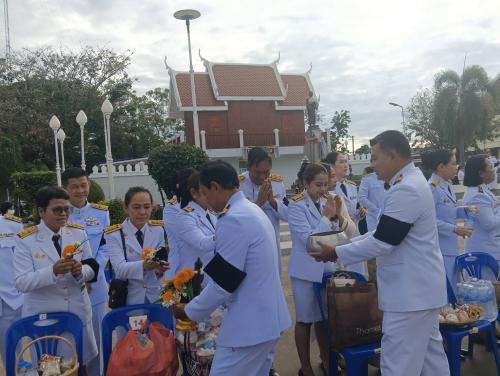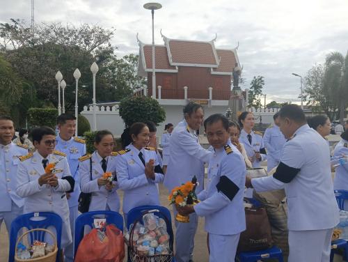 เวลา 07.30 น. พิธีเจริญพระพุทธมนต์และพิธีทำบุญตักบาตรข้าวสารอาหารแห้งแด่พระสงฆ์ เพื่อถวายเป็นพระราชกุศล